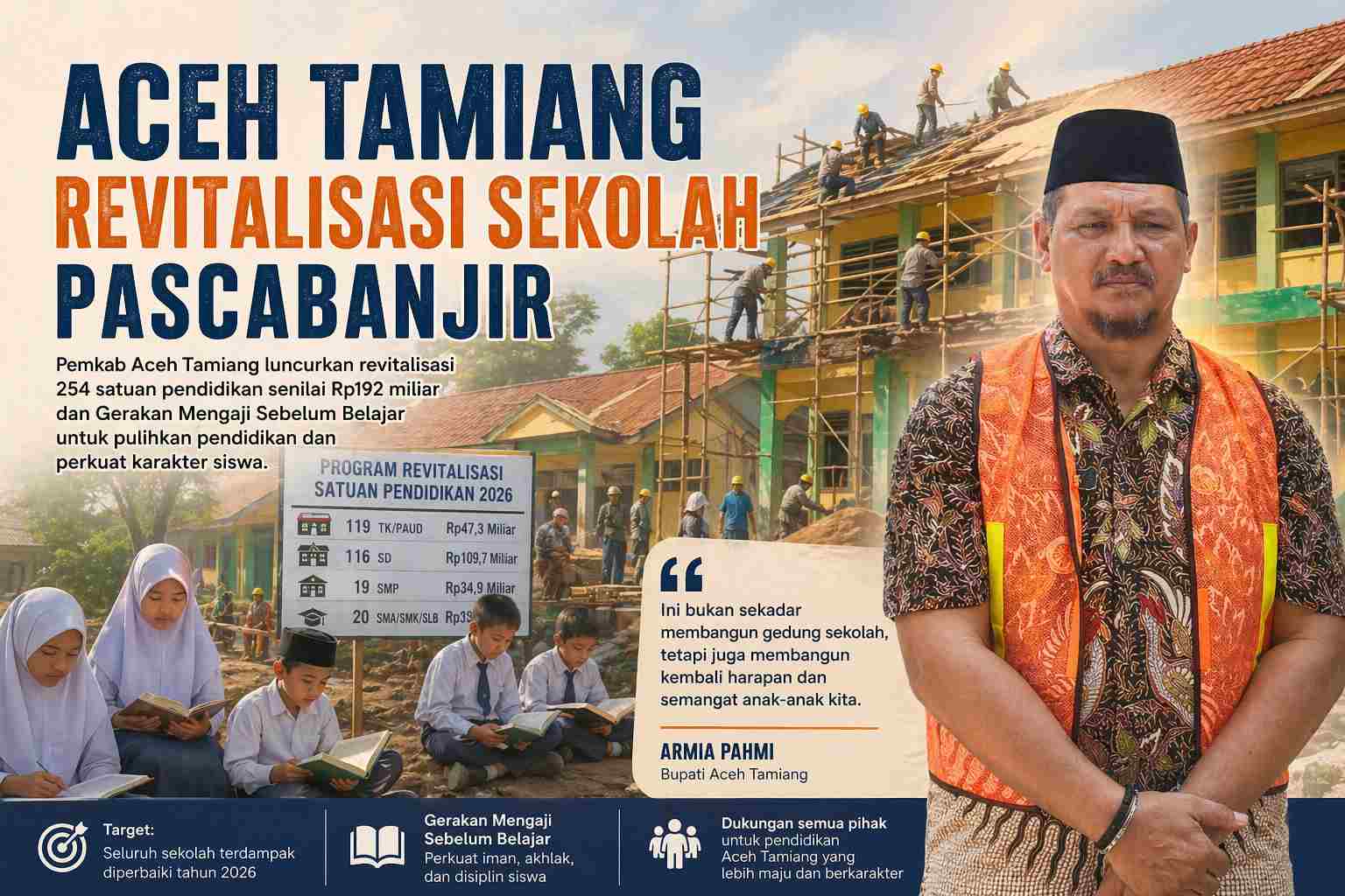- Pemkab Aceh Tamiang meluncurkan program revitalisasi satuan pendidikan senilai Rp192 miliar serta Gerakan Mengaji Sebelum Belajar untuk mempercepat pemulihan sekolah terdampak banjir sekaligus memperkuat pendidikan karakter siswa.