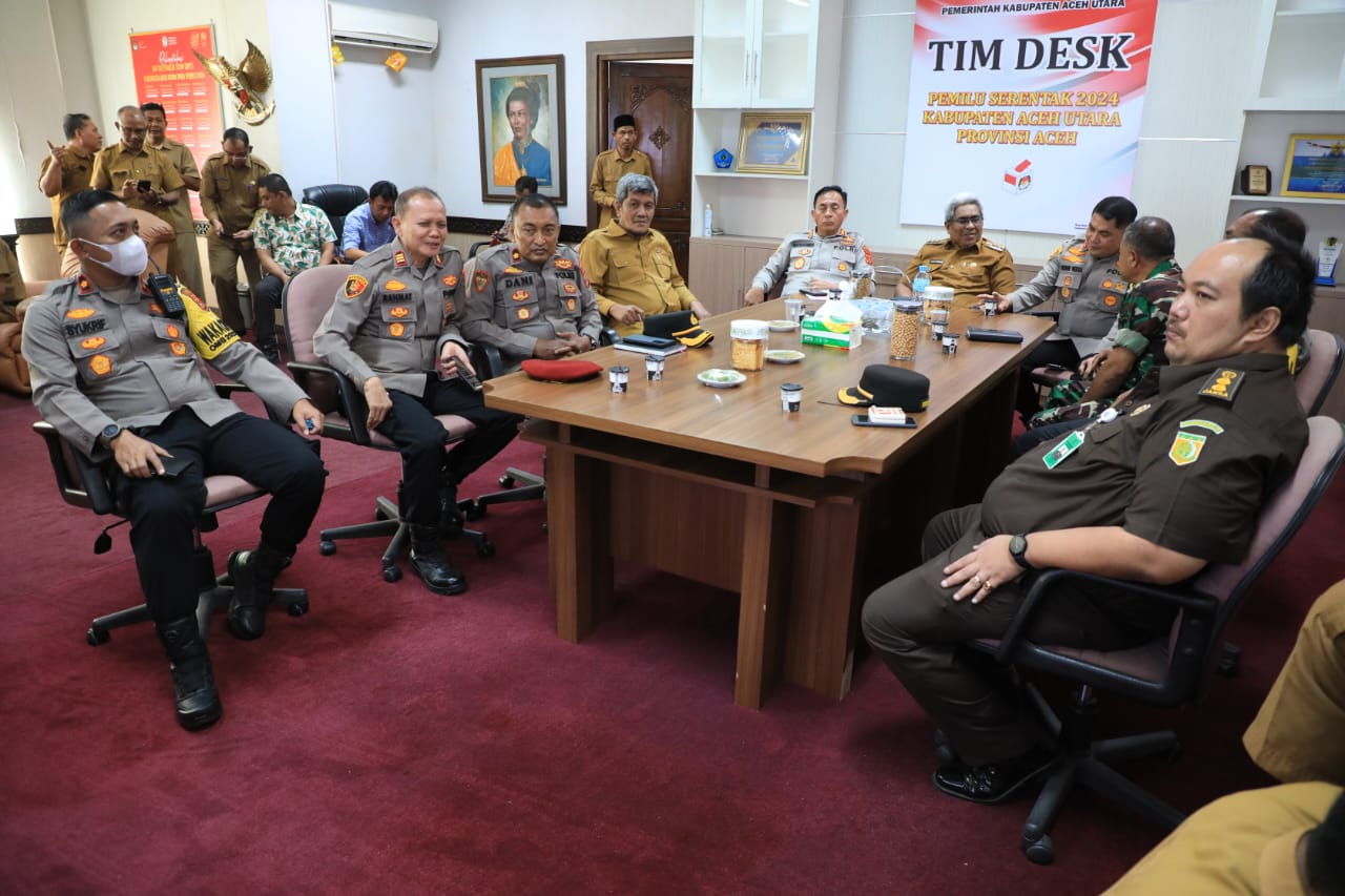 LHOKSUKON (MA) – Penjabat (Pj) Bupati Aceh Utara Dr. Mahyuzar, M.Si, bersama pejabat kepolisian dari Kepolisian Daerah (Polda) Aceh memantau persiapan final Tim Desk Pemilu 2024 Pemerintah Kabupaten Aceh Utara, Selasa, 13 Februari 2024.