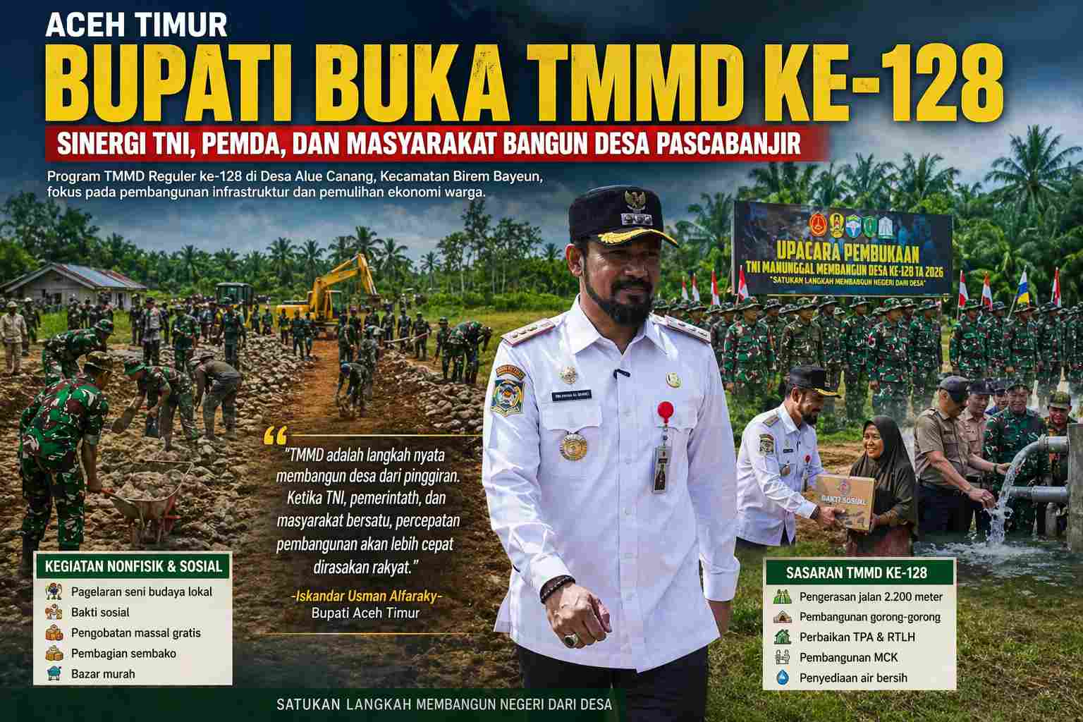 Di tempat itulah, Pemerintah Kabupaten Aceh Timur bersama Kodim 0104/Aceh Timur resmi memulai program TNI Manunggal Membangun Desa (TMMD) Reguler ke-128 Tahun 2026. Program lintas sektor tersebut menjadi salah satu langkah strategis untuk mempercepat pemulihan wilayah yang sempat terdampak banjir bandang beberapa waktu lalu.