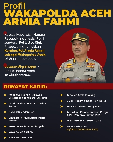 AGAM begitu sapaan akrab di keluarga dan teman-temannya untuk Drs. Brigjen Pol Armia Fahmi, MH. Wakil Kepala Polisi Daerah (Wakapolda) Aceh sejak dilantik pada medio 26 September 2023 lalu.