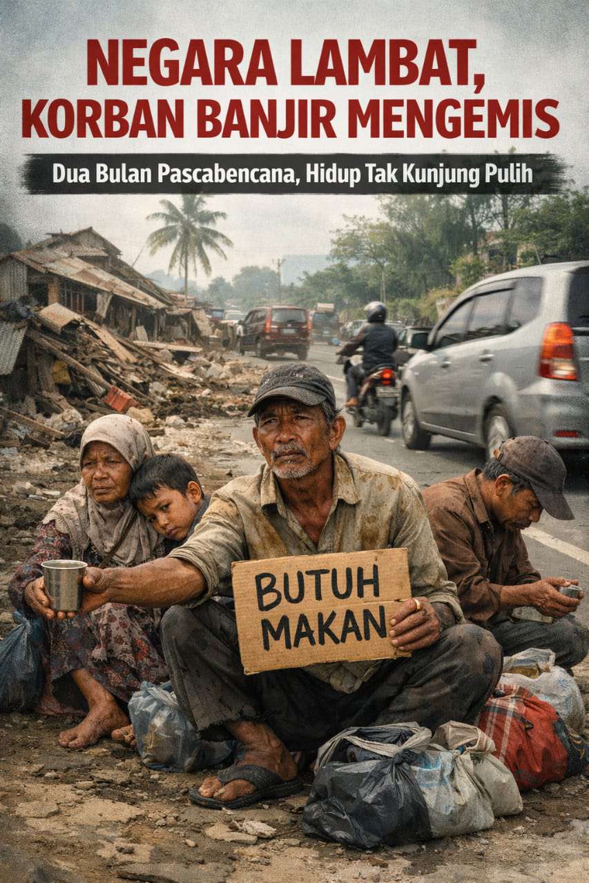 Hampir dua bulan setelah bencana ekologis menerjang, kehidupan para korban masih jauh dari pulih. Bantuan yang datang dinilai terbatas, tidak berkelanjutan, dan belum menyentuh persoalan paling mendasar; hilangnya sumber penghidupan.
