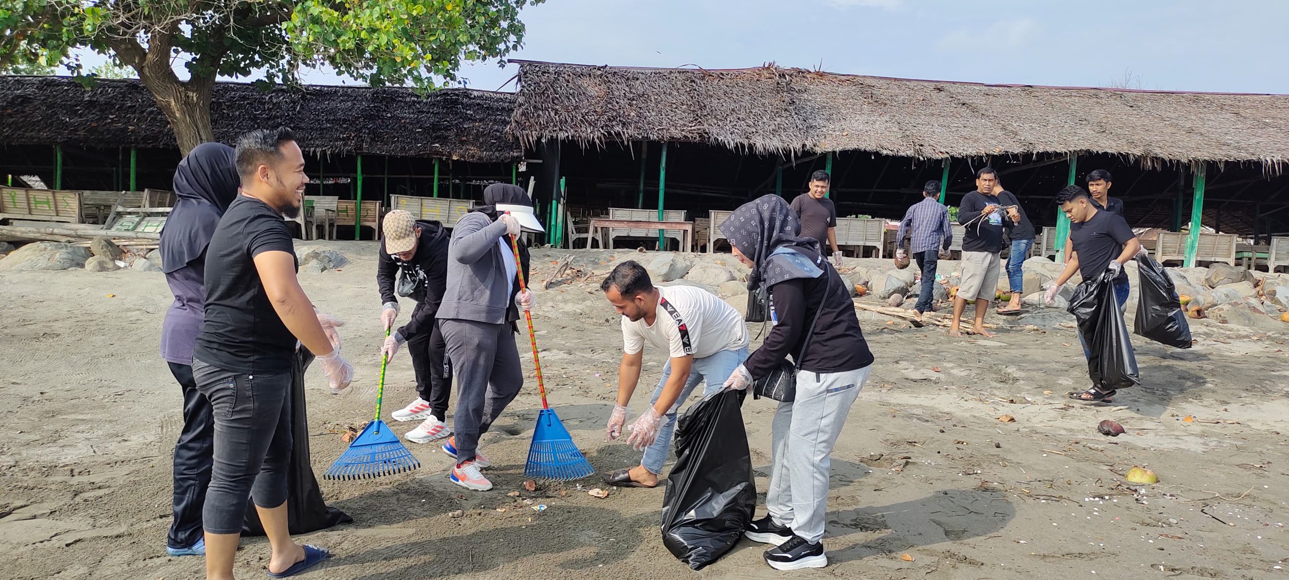 LHOKSEUMAWE (MA) — Ketua relawan Center Sayuti Khaidir Abubakar bersama sejumlah relawan menggelar gotong royong atau bersih-bersih di Pantai Ujong Blang, Kota Lhokseumawe, Kamis (15/8/2024).