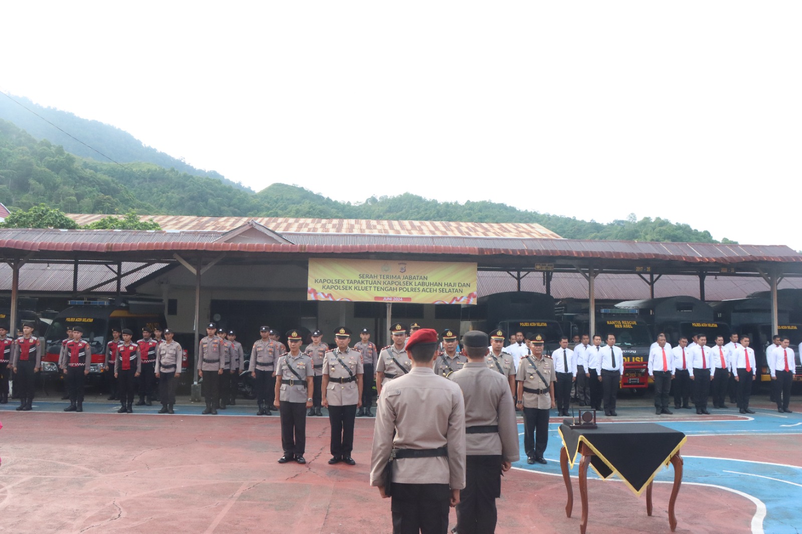 Pelaksanaan Sertijab secara bersamaan dipimpin Kapolres Aceh Selatan AKBP Mughi Prasetyo Habrianto di Lapangan Apel Mapolres Jalan T. Cut Ali Tapaktuan, Jum’at, (7/6).