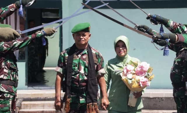 Mayor (Arh) Rahman bersama isteri berjalan meninggalkan Makodim 0107/Aceh Selatan dengan melewati tradisi pedang pora pertanda perwira menengah itu mengakhiri karir militer di Makodim, Senin, (5/1/2026).(Foto/mediaaceh.co.id/istimewa).