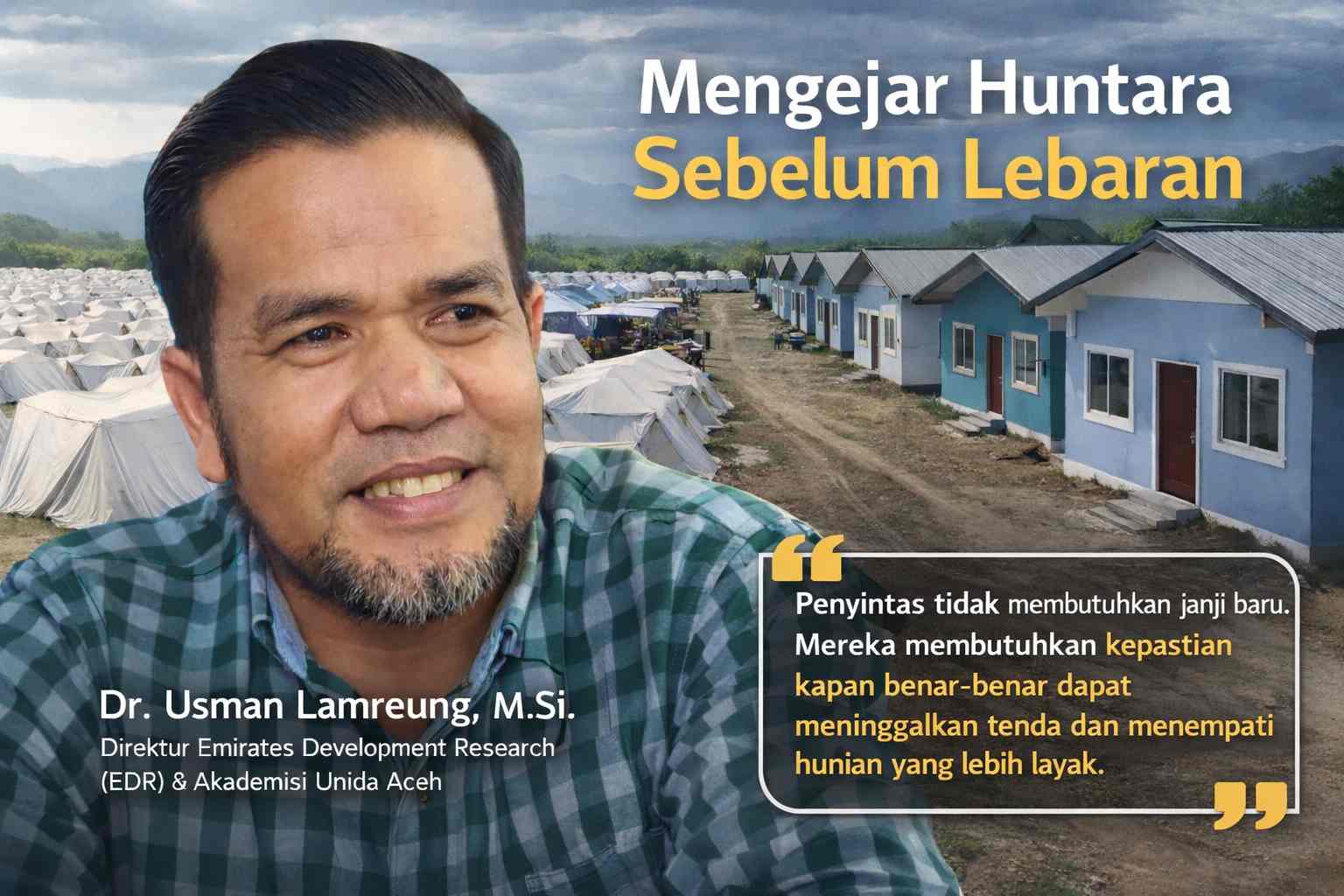 Direktur Emirates Development Research (EDR) sekaligus akademisi Unida Aceh, Dr. Usman Lamreung, M.Si., menilai percepatan pembangunan hunian sementara harus benar-benar dibuktikan dengan langkah konkret, bukan sekadar pernyataan di ruang publik.