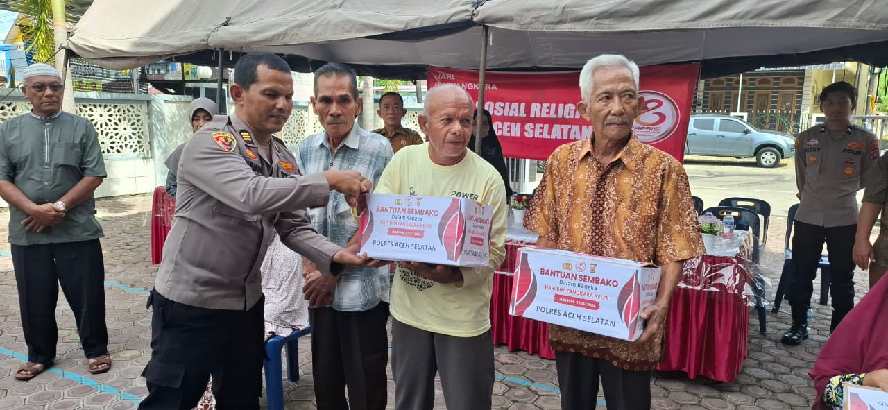 TAPAKTUAN : mediaaceh.co.id – Penyerahan Bantuan sosial (Bansos) dan kegiatan Bakti sosial (Baksos) secara serentak di seluruh Indonesia dilaksanakan, hari ini, Selasa, (25/6) dalam rangka HUT Bhayangkara tahun 2024. Di Aceh Selatan, Gampong Lhok Bengkuang dipilih jadi tempat kegiatan tersebut.